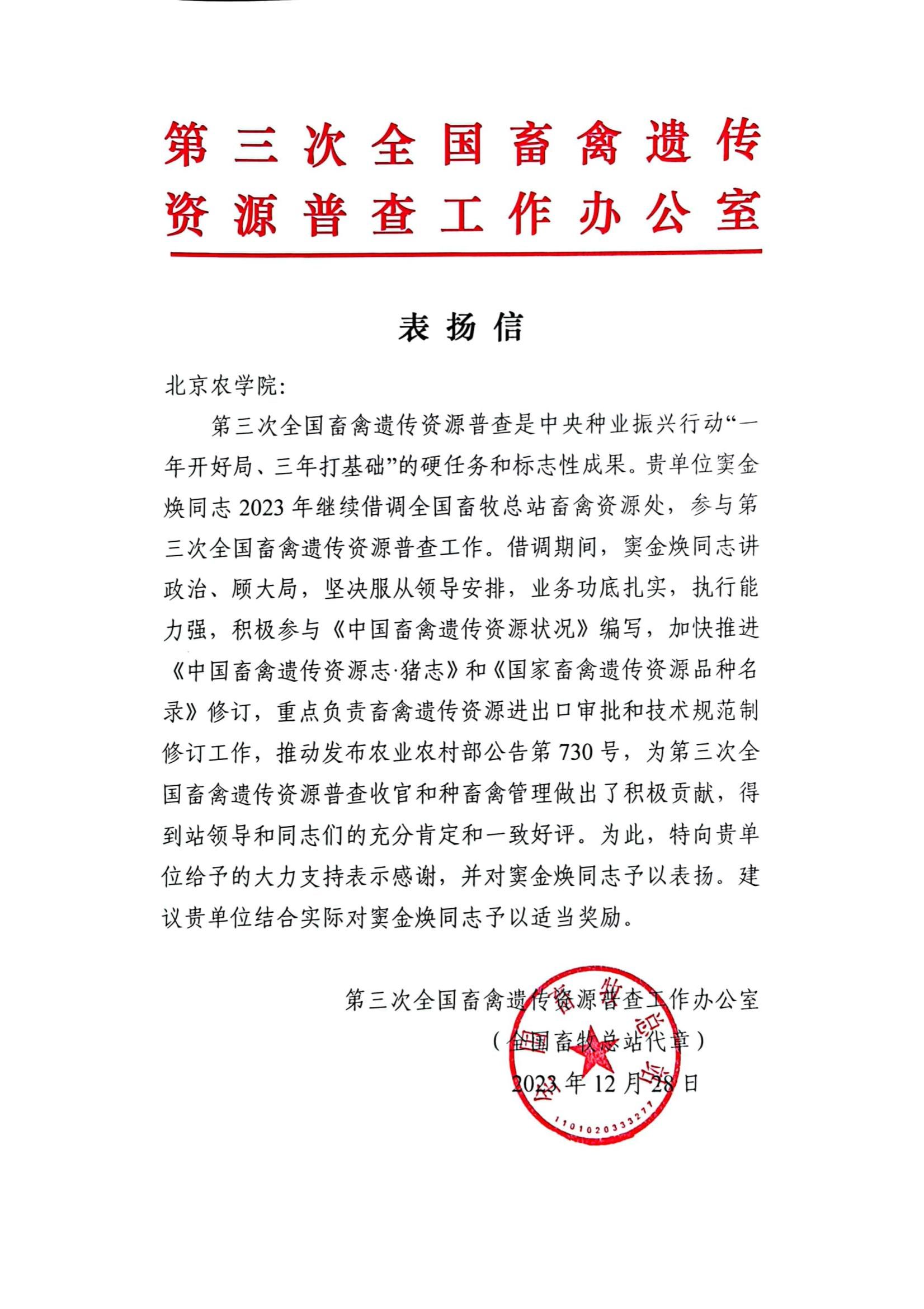 近日,第三次全国畜禽遗传资源普查工作办公室发来《表扬信》,对普查工作中表现突出的红桃视频 教师窦金焕同志予以表扬。