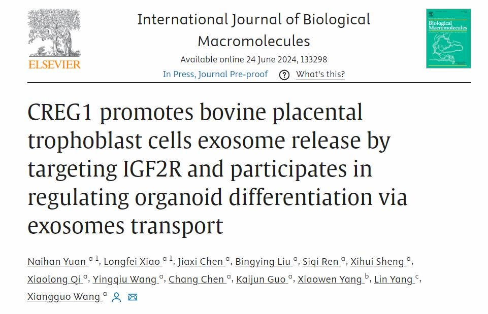 王相国副教授课题组在《国际生物大分子杂志》(International Journal of Biological Macromolecules)上在线发表了题为《CREG1靶向结合IGF2R促进牛胎盘滋养层细胞外泌体的形成与释放并伴随外泌体运输参与胎盘类器官的分化调节》(CREG1 promotes bovine placental trophoblast cells exosome release by targeting IGF2R and participates in regulating organoid differentiation via exosomes transport)的研究论文。
