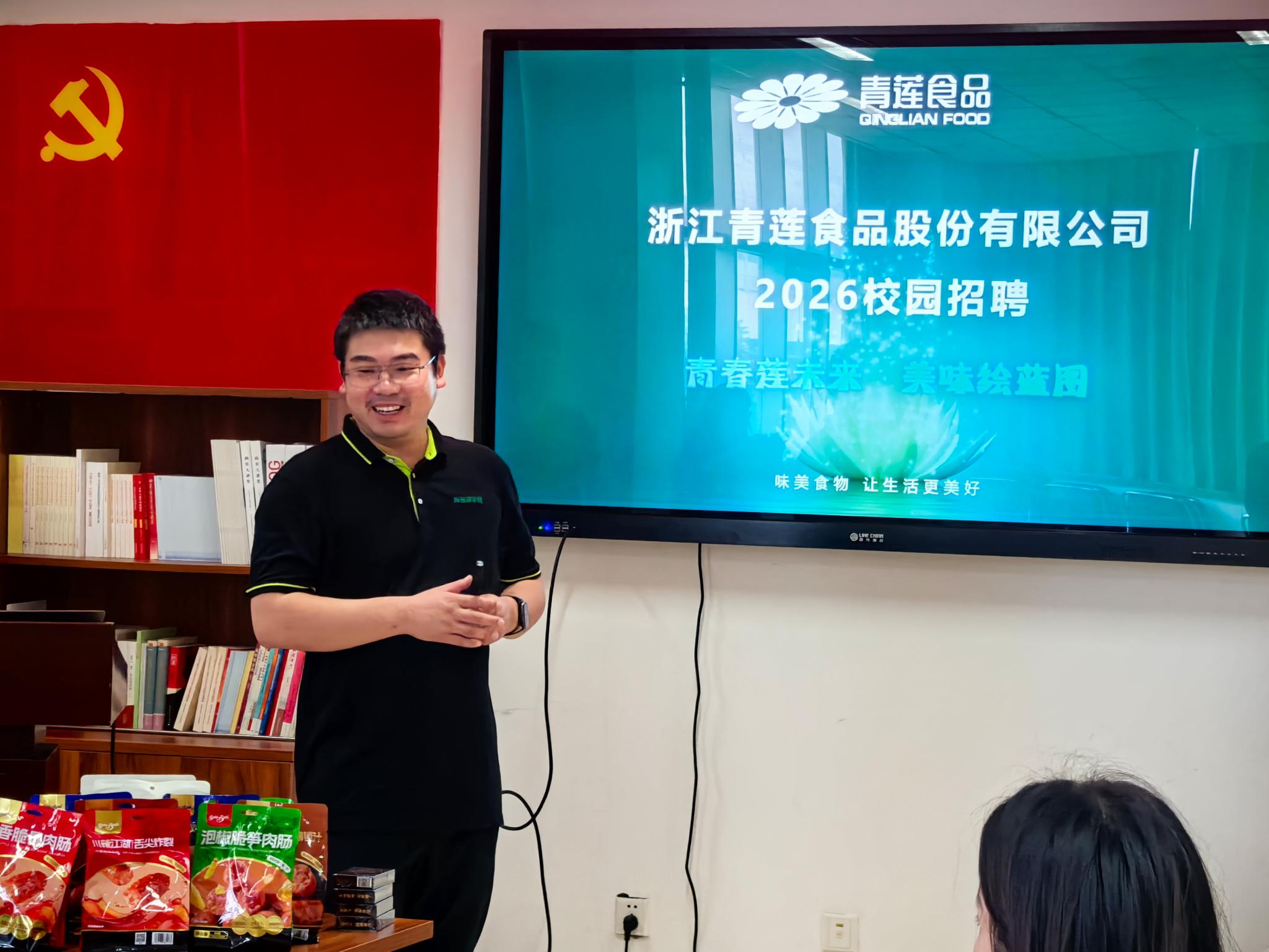 本次明星企业邀请的是来自浙江的青莲食品股份有限公司。宣讲会上,青莲食品股份有限公司集团招聘经理彭佳豪详细介绍了企业二十四年的品牌发展历史、“味美食品,让生活更美好”的使命、优秀的科研创新能力以及“创造健康、快乐、受人喜爱的美食”的产品理念,重点讲解了目前公司招聘岗位的工作内容、薪资待遇和福利保障体系。