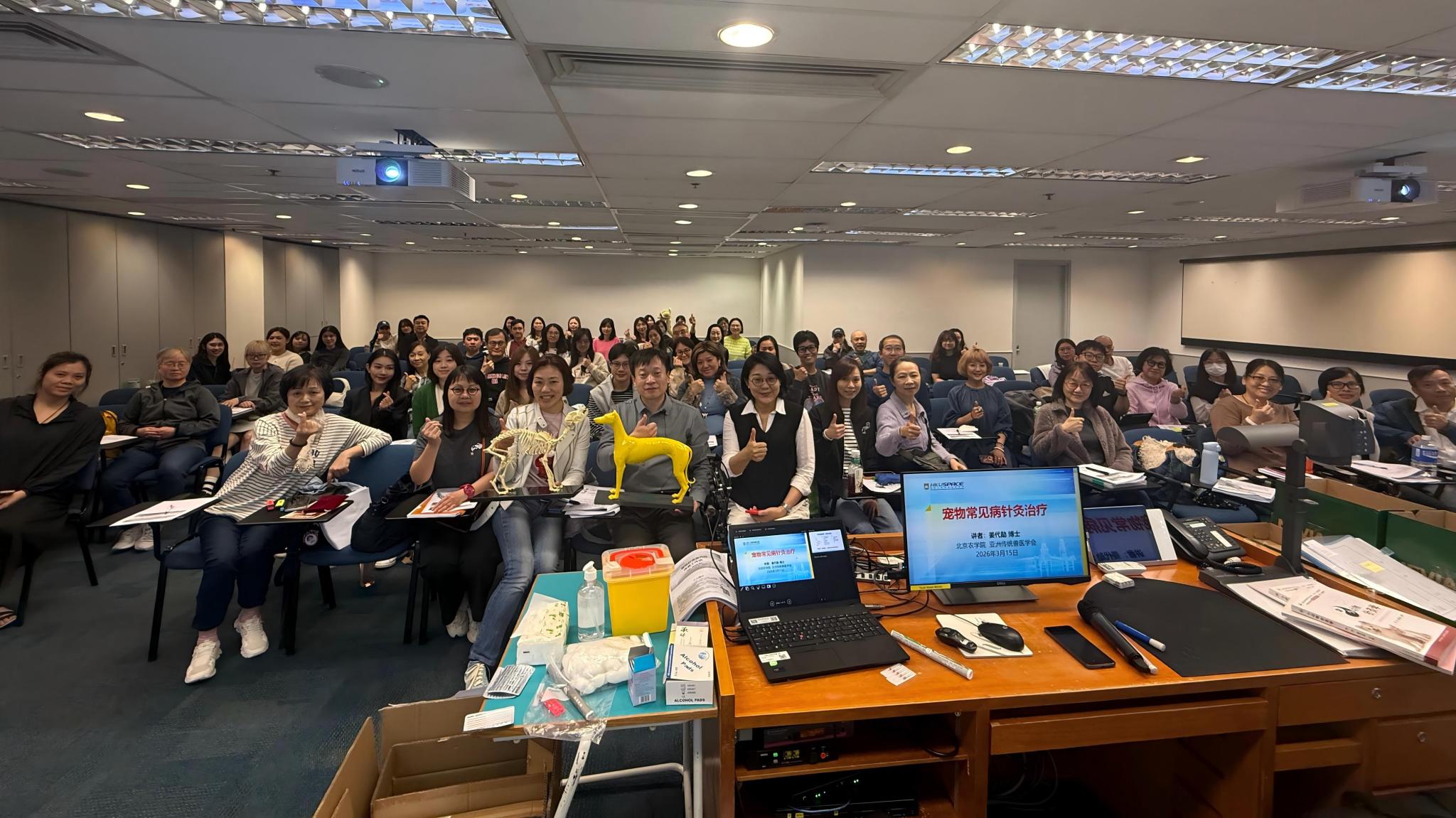 主编的农业农村部“十四五”规划教材《小动物针灸学》及自主研发的犬腧穴模型,赴香港大学开展了多个课时的短期宠物针灸技术教学指导活动。姜代勋副教授结合学术和临床两个角度,分享了宠物针灸和腧穴保健的经验,教学内容涵盖宠物常用腧穴定位、宠物针灸疗法、宠物常见病治疗等。亚洲传统兽医学会在港秘书黄红蓝女士全程协助本次活动。