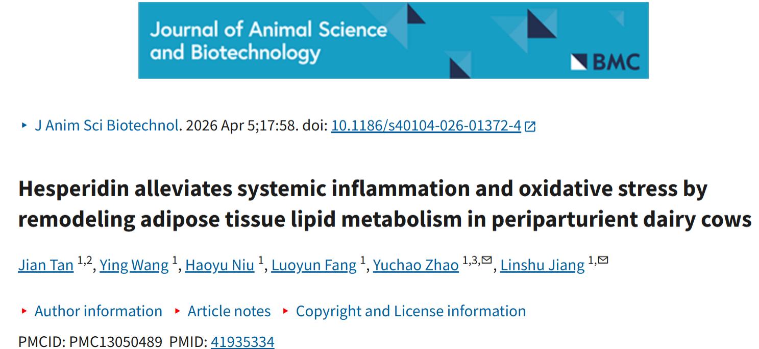 奶牛营养学北京市重点实验室蒋林树教授团队在农林科学领域顶尖国际英文期刊《Journal of Animal Science and Biotechnology》发表研究成果,聚焦橙皮苷(Hesperidin)对围产期奶牛的代谢调控作用,通过多组学(代谢组、脂质组、蛋白质组)结合生理生化检测,阐明了橙皮苷通过重塑脂肪组织脂质代谢,缓解围产期奶牛全身炎症和氧化应激、改善乳品质与代谢健康的分子机制,为围产期奶牛的营养调控提供了全新的植物源策略。