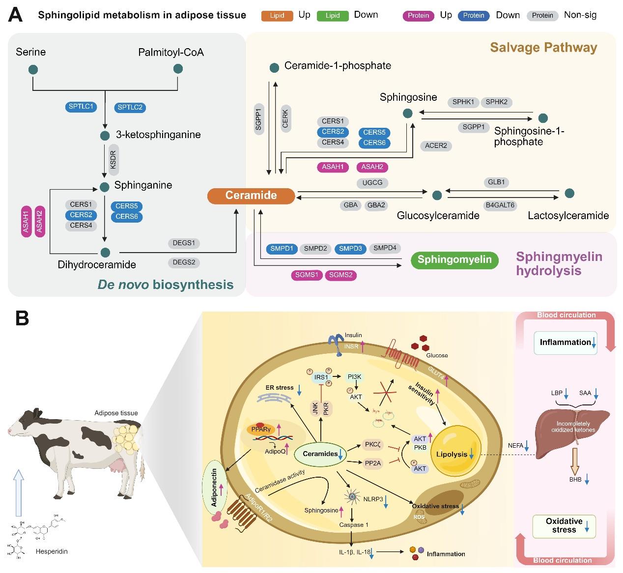 该研究指出日粮添加橙皮苷可下调关键神经酰胺合成酶(CERS2、CERS5、CERS6)的表达并减少神经酰胺蓄积,同时促进鞘磷脂合成(SGMS1/2)与水解(SMPD1/3)。这些协同变化表明橙皮苷可降低脂肪组织神经酰胺负荷,增强鞘脂代谢重塑。橙皮苷代谢产物在脂肪组织中蓄积,一方面促进过氧化物酶体增殖物激活受体γ(PPARγ)活化和脂联素分泌,另一方面抑制神经酰胺介导的内质网应激、NLRP3-caspase-1炎症小体激活、氧化应激及脂解过程。上述变化可改善胰岛素信号传导与葡萄糖摄取,降低循环非酯化脂肪酸(NEFA)和β-羟丁酸(BHBA)水平,最终缓解全身氧化应激与炎症反应。