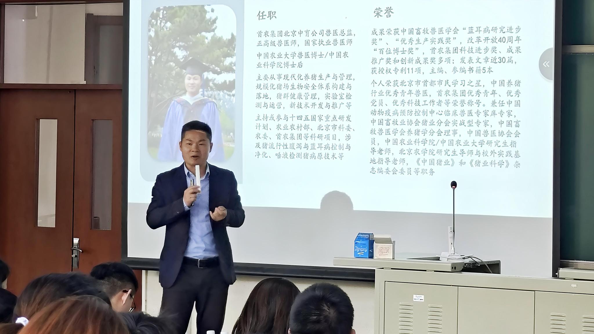 许光勇结合自身从业经历,分享了兽医职业的社会价值与行业责任,通过真实案例展现了兽医行业的坚守与初心,为同学们提供了可借鉴的职业发展路径,激励学子们在行业中深耕细作、实现价值。